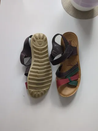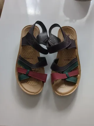 Sandalias cómodas y ligeras con un diseño moderno. - Tiras en varios colores: marrón, verde y rojo. - Suela con textura. - Cierre de velcro.