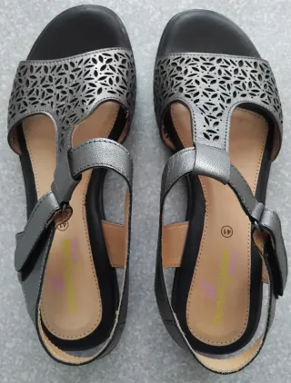 Elegantes sandalias de piel para mujer, perfectas para cualquier ocasión. - Hechas en España. - Diseño con detalles troquelados. - Cierre ajustable con velcro. - Suela cómoda.
