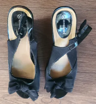 Sandalias de cuña en color negro, perfectas para añadir un toque elegante a tu look. - Diseño abierto en la punta. - Adorno de lazo en la parte delantera. - Correa ajustable en el tobillo. - Cuña alta y cómoda.