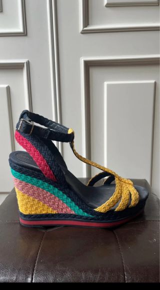 Sandalias de cuña con un diseño vibrante y veraniego Tommy Hilfiger Modelo Vancouver - Tiras trenzadas en varios colores. - Correa de tobillo ajustable. - Cuña con acabado de esparto. Poco uso. Se incluye caja original