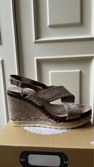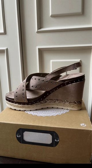 Sandalias de cuña con tiras cruzadas y detalle de ojales. Marca:Xti Color: taupe Talla 38 Altura cuña: 10 cm - Material exterior de ante. - Cuña forrada de esparto. - Tira de tobillo ajustable. - Adorno metálico en la tira. Se incluye caja original