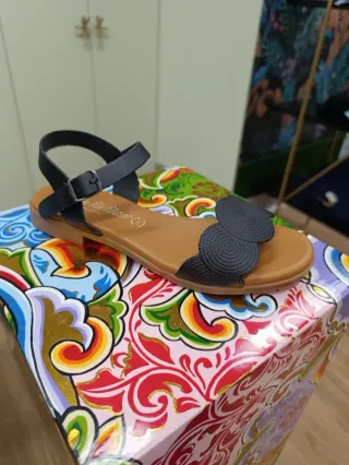 Sandalia de la marca Carla Tortosa en color negro y marrón. - Diseño con tiras. - Cierre de hebilla. - Detalle de círculos en la pala. Disponible en 36, 37 y 38 Precio por unidad. Precio anterior 50€