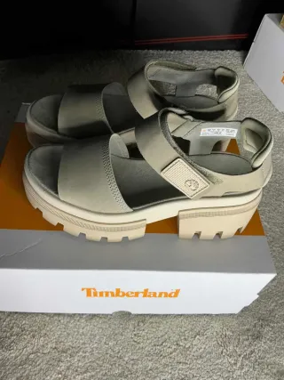 Sandalias Timberland de color beige con plataforma. - Diseño abierto con tiras. - Cierre de velcro ajustable. - Suela gruesa y robusta. Estado: perfectas, utilizadas en una única ocasión Se envían con su caja original Precio en tienda: 150'99€ Se hacen envios