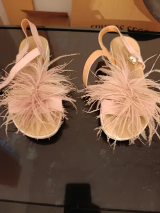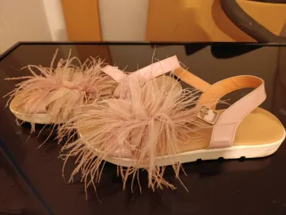 Sandalias con un diseño delicado y adornos de plumas. - Tiras finas y ajustables. - Detalle de plumas suaves en la pala. - Suela cómoda.