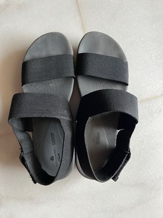 Sandalias de la marca Clarks en color negro, talla 38. - Diseño con tiras elásticas. - Cierre de velcro en la tira trasera. - Plantilla con tecnología Cushion Soft.