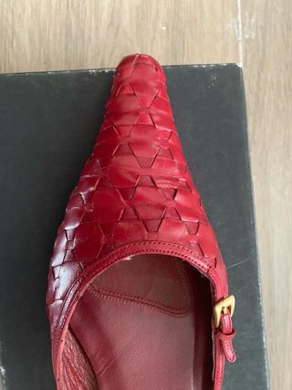 Elegantes sandalias destalonadas de Massimo Dutti. - Diseño trenzado en la parte delantera. - Tacón fino y puntera afilada. - Hebilla ajustable en el tobillo.