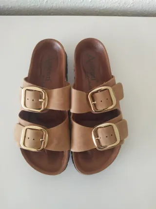 Sandalias de creeks de piel y tacon de madera, súper ligeras y cómodas, plantilla, tirante e interior de piel genuina, casi sin usar (ver la foto de planta)