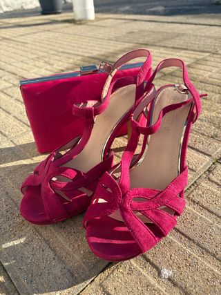 Elegante conjunto de sandalias de tacón y bolso a juego en un vibrante color rosa fucsia. Ideal para complementar tu atuendo. - Sandalias con tiras y cierre de hebilla. - Bolso tipo clutch con cierre metálico.