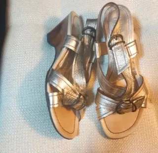Preciosas sandalias de cuña en color gris perla. Precio original 64,99€ Son muy cómodas Usadas solo en una ocasión - Diseño con perforaciones. - Cierre de tira con belcro Tags calzado mocasines ropa jersey vestido fiesta falda pantalón pantalones pañuelo blusa camisa camiseta niki americana