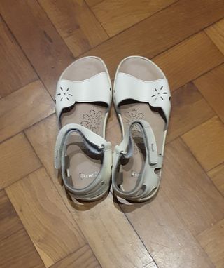 Sandalias de la marca Camper en talla 34. - Color crema. - Diseño abierto con tiras. - Cierre de velcro en el tobillo. - Suela de goma con textura.