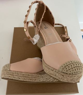 Sandalias de cuña con un diseño elegante y veraniego. No pesan nada. La cuña en la parte más alta mide 9cm, la plataforma delantera en la zona de los dedos mide 2,5cm. - Material exterior con detalles de red. - Correa ajustable en el tobillo con hebilla. - Cuña forrada de esparto. Están usadas UNA VEZ, por lo que están prácticamente nuevas.