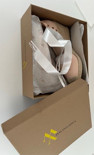 Sandalias de esparto con detalle de red y lazos. Son nuevos con etiqueta - Diseño abierto en la puntera. - Cierre con lazada al tobillo. - Suela de esparto. - Detalle de red en la parte delantera.