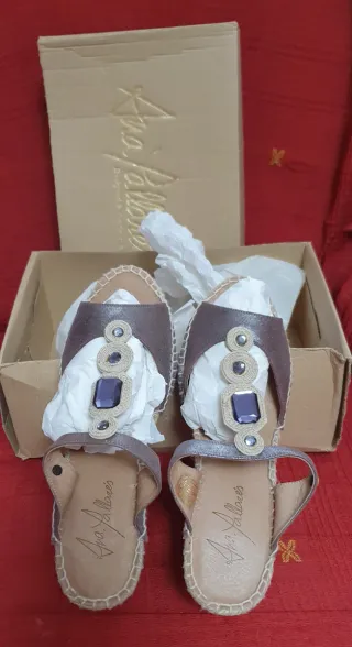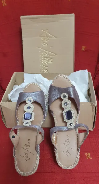 Sandalias de verano de la marca Ana Pallarés. Un calzado cómodo y con un diseño original. - Tira delantera adornada con pedrería y detalles de esparto. - Suela de esparto. - Tira fina en el tobillo. - Con plataforma. - Nuevas sin estrenar.
