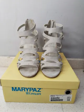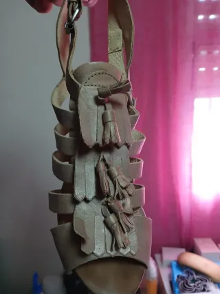 Sandalias de plataforma con un diseño moderno y elegante. Tiene desgaste en un talon. Y roces que se ven en la foto - Cierre de tira. - Punta abierta.