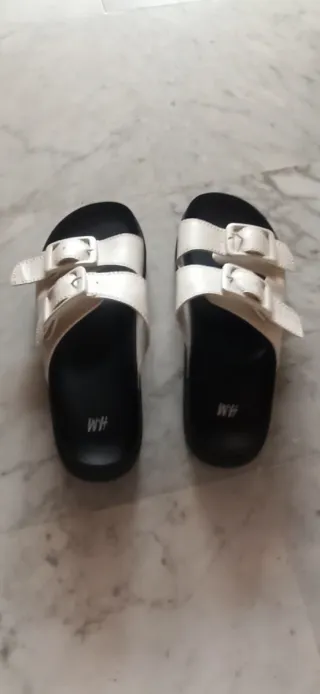 Sandalias de tiras en color marfil. - Diseño con dos tiras ajustables. - Hebillas metálicas. - Suela negra. - Marca: H&M. Nº 38. - Usado en tres ocasiones, como nuevas!! Sandali avorio con cinturini. - Due cinturini regolabili. - Fibbie in metallo. - Suola nera. - Marca: H&M. Taglia 38. - Indossati tre volte, come nuovi! Sandálias de tiras cor marfim. - Duas tiras ajustáveis. - Fivelas de metal. - Sola preta. - Marca: H&M. Tamanho 38. - Usadas três vezes, como novas!