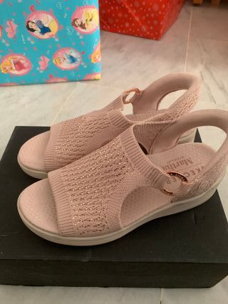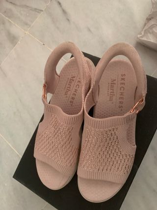 Sandalias Skechers de color rosa con un diseño tejido y detalles brillantes. Solo 4 usos. - Material textil transpirable. - Tira ajustable en el talón. - Suela cómoda y flexible.
