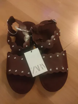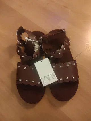 Sandalias de la marca Zara en color marrón y talla 38. Presentan un diseño con borde festoneado y adornos de tachuelas plateadas. - Detalle de tachuelas plateadas. - Borde con diseño festoneado.
