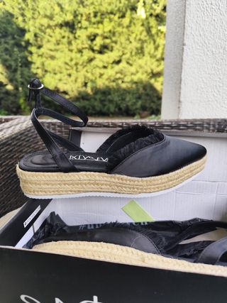 Sandalias de esparto con tiras negras. - Cierre con hebilla dorada. - Plataforma de esparto. talla 38, usadas una vez.