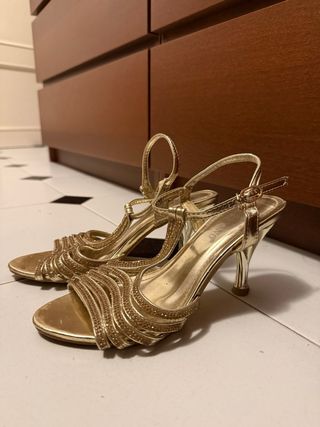 Elegantes tacones dorados, usados una sola vez. Perfectos para eventos especiales. - Diseño con tiras adornadas con pedrería. - Tacón fino y delicado. - Cierre de hebilla ajustable.