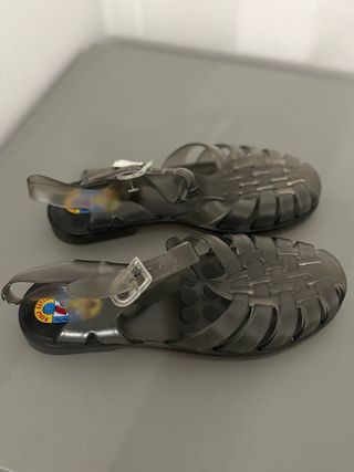 Sandalias de goma tipo cangrejera. Estan nuevas sin usar aunque la goma esta un poco pegajosa. - Material: Goma. - Color: translúcido. - Cierre de hebilla. - Suela de goma.