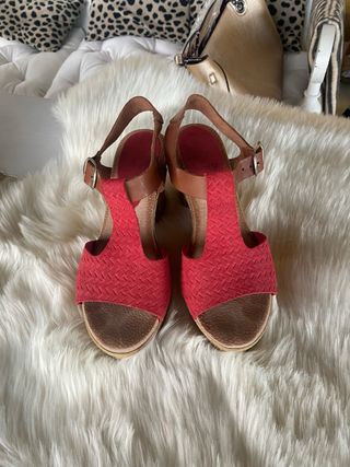 Elegantes sandalias de tacón con un diseño moderno y llamativo. - Acabado brillante en color coral. - Cierre de hebilla en el tobillo. -Están algo deterioradas por algunos sitios que se puede ver en las fotos