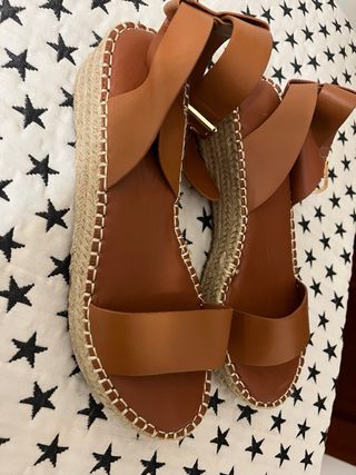 Sandalias de cuña en color marrón.,Son de cuero - Diseño abierto con tira. - Cierre de hebilla. - Suela de esparto. Precio negociable