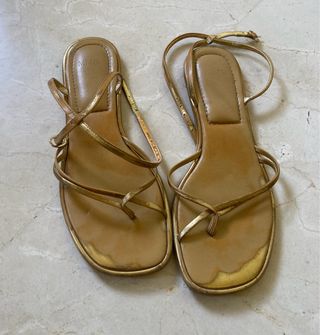 Elegantes sandalias doradas con tiras finas. - Diseño de tiras finas. - Cierre de hebilla. - Detalle de logo en la plantilla. - Usadas y algo gastadas