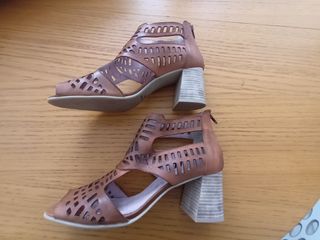 Sandalias de piel marrones Marca Cayetano Giménez Número 40 Tacón 7 cms Diseño troquelado Cremallera trasera Muy cómodas