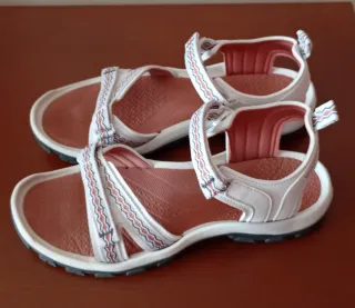 Sandalias de trekking Quechua en tonos grises y rosas. - Cierre de velcro ajustable. - Suela de goma adherente. - Diseño abierto para mayor transpirabilidad.