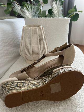Sandalias cuña media beige y doradas talla 39