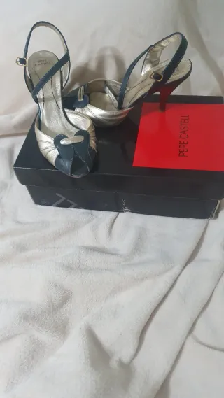 Elegantes sandalias de la marca Pepe Castell. - Diseño con tiras en contraste. - Tacón fino y puntera abierta. - Cierre de hebilla ajustable.