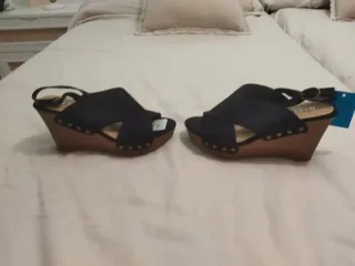Sandalias de cuña con un diseño elegante y moderno. - Material: Piel sintética. - Cierre de hebilla. - Punta abierta. - Plataforma alta.