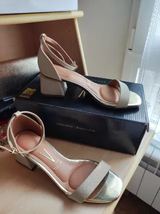 Elegantes sandalias con un toque brillante. - Diseño de tiras. - Tacón bajo cuadrado. - Cierre de hebilla al tobillo. Talla 37. Usadas una vez, para una boda. Opcional bolso dorado a juego por 3 euros más.