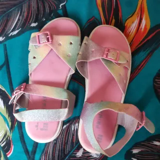 Sandalias planas para niña con un diseño divertido y brillante. - Tiras con hebilla ajustable. - Detalles de corazones troquelados. - Acabado con purpurina iridiscente.
