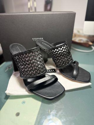 Elegantes sandalias de STEPHEN VENEZIA. - Diseño con tiras de cuero y detalle de red. - Tacón cuadrado. - Punta cuadrada.