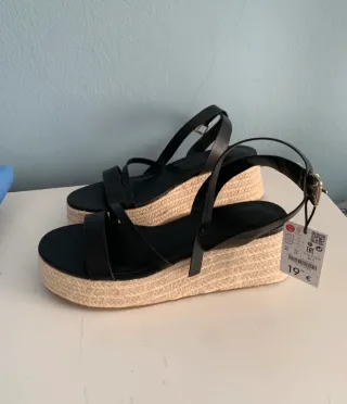 Elegantes sandalias de cuña en color negro. - Diseño con tiras cruzadas. - Cierre de cremallera en el talón. - Punta abierta.