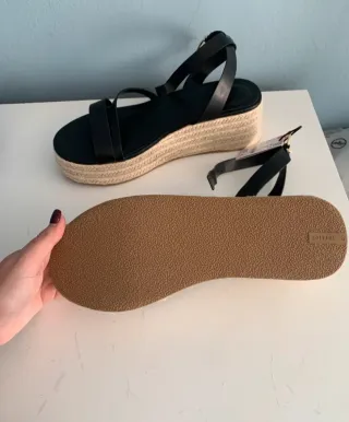 Sandalias de plataforma con tiras en color negro y detalle de esparto en la suela. - Cierre con hebilla. - Diseño de tiras finas.