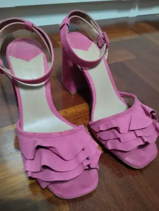Elegantes sandalias de tacón en color rosa. - Diseño con volantes en la parte delantera. - Correa ajustable al tobillo con hebilla. - Tacón grueso y cómodo.