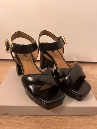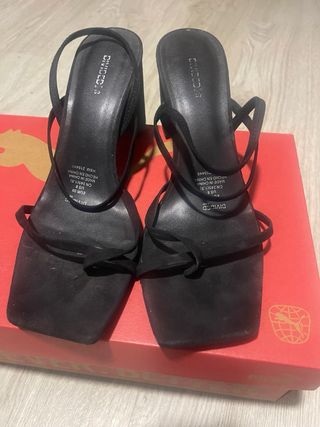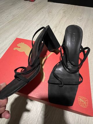 Sandalia de tacón de Zara con dos colores, negro y azul. Puestas una sola vez, es un número 36 pero a mi me queda estrecho. Tacón alto y fino. Cierre de cremallera en el talón.