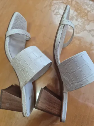 Sandalias de tacón con diseño de cocodrilo. - Color beige. - Tira ancha en la parte delantera. - Tira fina en la parte delantera.