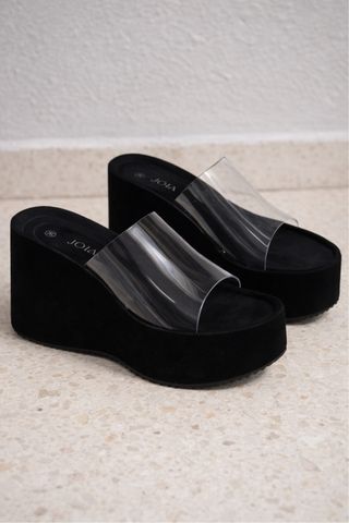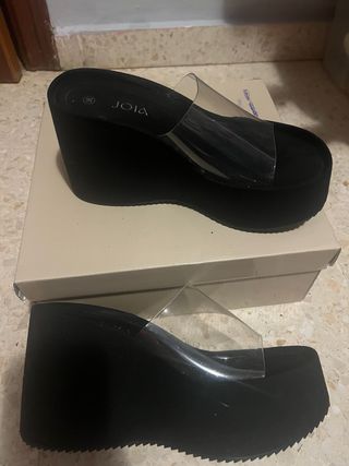 Sandalias de cuña negras con tiras transparentes, en excelente estado. - Diseño moderno y elegante. - Suela de plataforma alta. - Marca: JOIA.