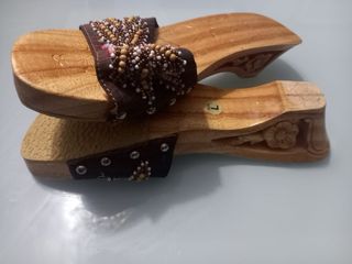Sandalias de madera tipo suecos abiertos para mujer. Presentan un diseño con tiras adornadas con abalorios y lentejuelas. - Tiras decoradas con abalorios y lentejuelas. - Suela de madera con grabado floral. - Estilo abierto.
