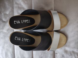 Sandalias de la marca Eva López, usadas una sola vez. Son cómodas y elegantes. - Diseño de tiras cruzadas. - Suela de madera. - Detalle de tira plateada.