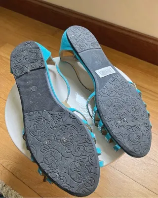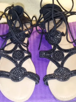 Sandalias de piel nuevas y con su caja. Son preciosas y de muy buena calidad. - Diseño de tiras finas. - Adorno de pedrería y cuentas negras. - Cierre de hebilla ajustable.