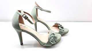 Preciosas sandalias de tacón de la marca Menbur, en color verde y talla 38. Ideales para ocasiones especiales. Cómodas y elegantes. - Material de ante. - Diseño con flor en la parte delantera. - Cierre de hebilla en el tobillo.