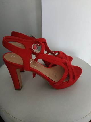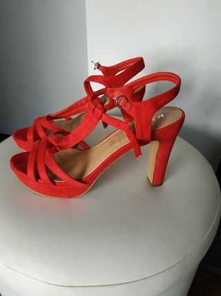 Sandalias de tacón rojas. Son de ante, con un tacón y cierre de hebilla. Están en buen estado, nunca usadas. - Tacón alto. - Cierre de hebilla. - Material: ante.
