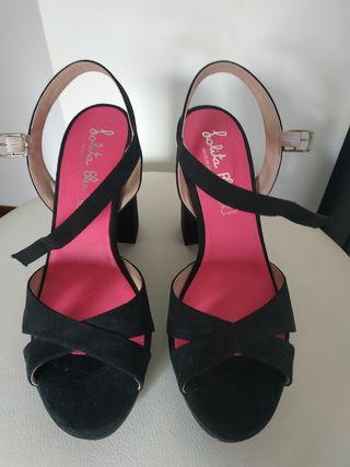 Sandalias de tacón de la marca Lolita Blue Son de color negro y tienen un diseño elegante. Sin estrenar. - Tacón grueso y cómodo. - Material de ante. - Cierre de hebilla en el tobillo. - Perfecto estado.