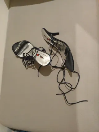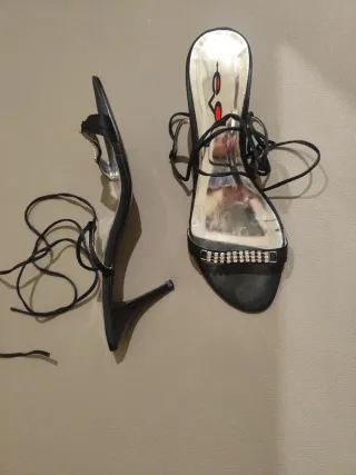 Elegantes sandalias de tacón con un diseño de tiras que se anudan al tobillo o en la pierna .Perfectas para añadir un toque de brillo a tu atuendo. - Detalle de pedrería en la tira delantera. - Tiras finas que se pueden cruzar y anudar. - Tacón fino. - No hago envíos !!!.