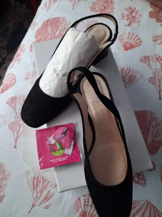 Elegantes sandalias de ante negro de la marca Hispanitas. Packaging y pulsera Hispanitas - Material: Ante. - Color: Negro. - Diseño slingback con tira al talón. - Tacón bajo y cómodo.
