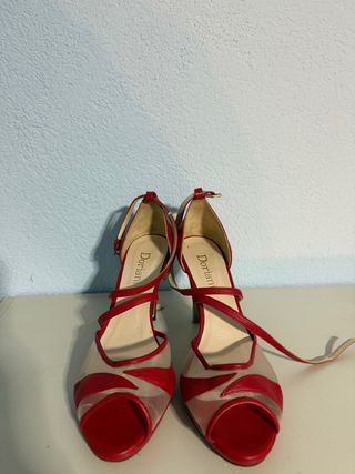 Elegantes sandalias de piel en color rojo, con un diseño abierto y detalles de malla. - Cierre de tira al tobillo. - Tacón alto y fino. - Detalle de tiras cruzadas en la parte delantera. - Suela con pequeña plataforma delantera.